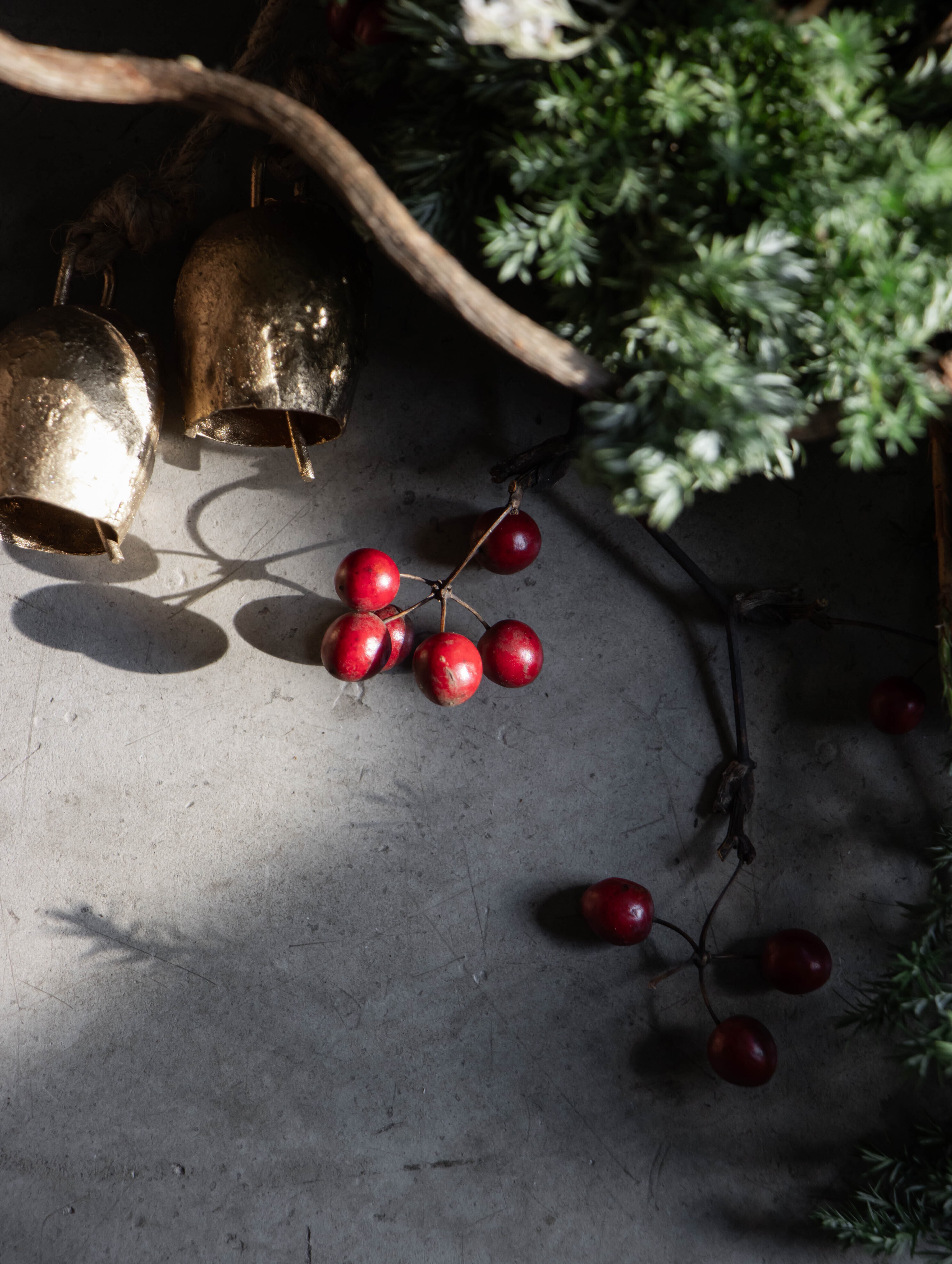 【使用花材】薩摩杉 /ぶどうの葉 / ドライ木の実 / ベル等